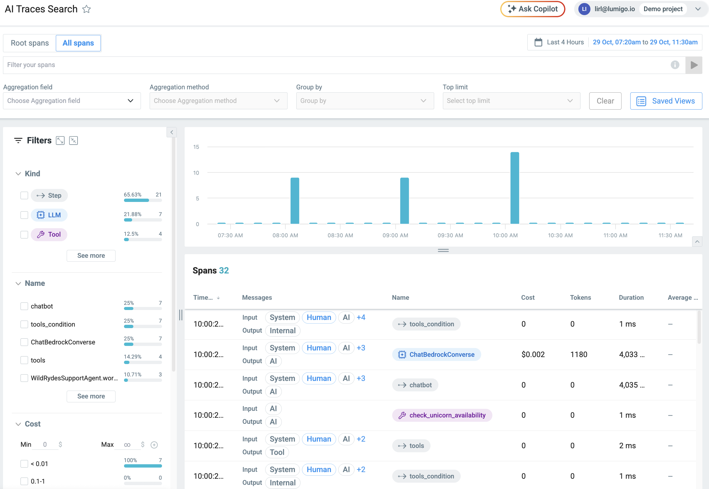 Detailed Metrics: Visualize cost, duration, and tokens. Break down data by model ID, agent, and other dimensions to derive business and operational insights.